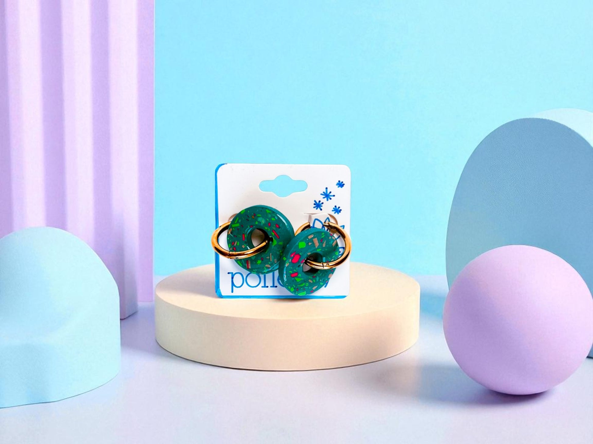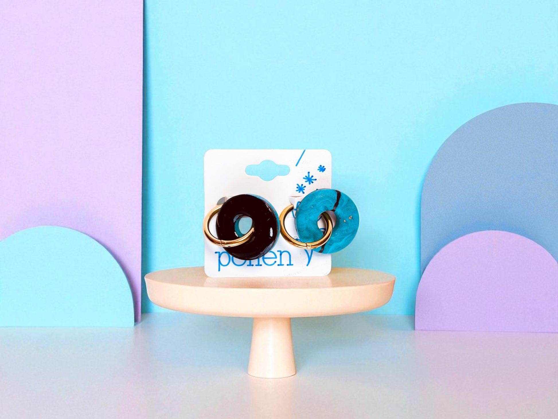 Ces boucles d’oreilles en forme de donut sont coulées à la main en Jesmonite, dans mon atelier, en petites séries.
